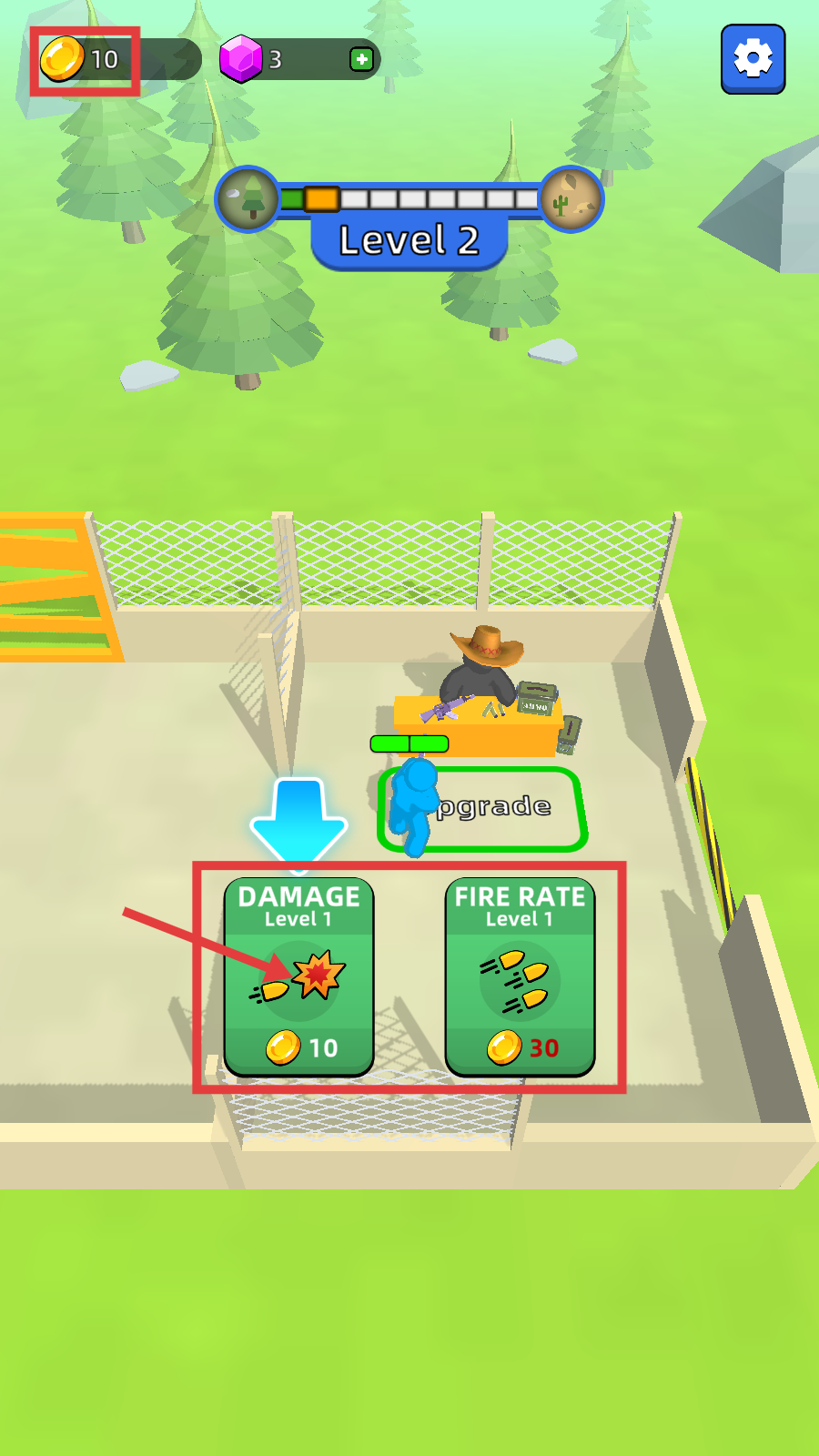 3、积累足够金币后,可选择升级【DAMAGE-Level-1】或【FIRERATE-Level-1】,提升角色战斗能力,方便应对更多敌人。