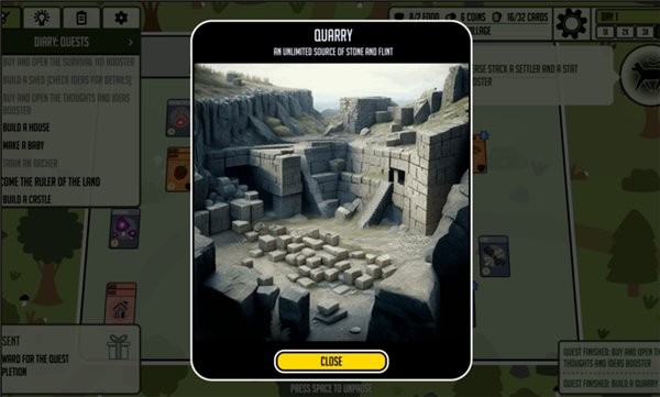 1、通过将木头、石头等资源卡牌“堆叠”建造房屋、农田等设施,以此实现建筑升级和资源生产 。