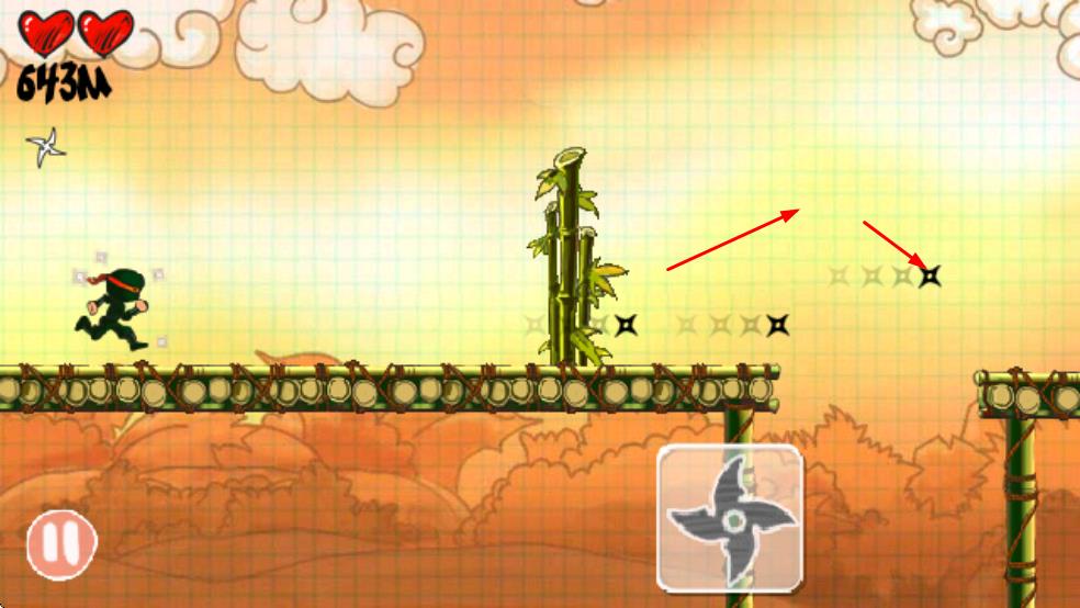 2、在奔跑过程中,会遇到黑色飞镖等障碍物,此时点击屏幕下方的飞镖图标,能发射飞镖来消除这些障碍物,保障忍者顺利前行。