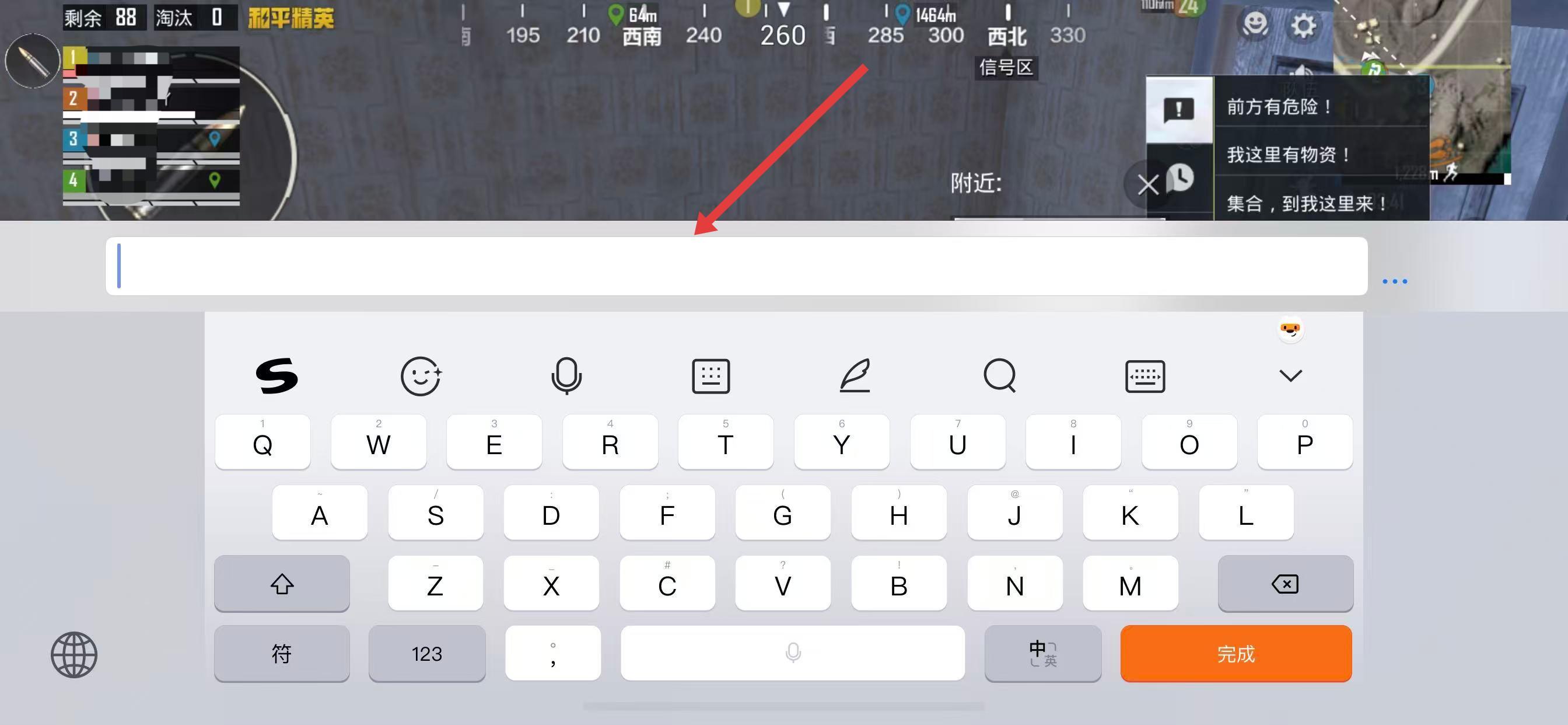 3、屏幕下方会弹出输入法键盘,输入想要发送的文字内容,即可将信息发送给队友。