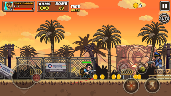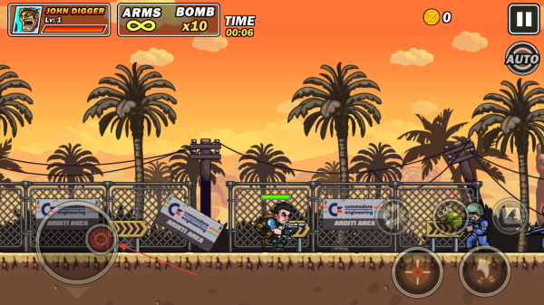 1、进入游戏查看左上角角色信息JOHN DIGGER,用左下方虚拟摇杆控制角色移动,躲避敌人攻击。