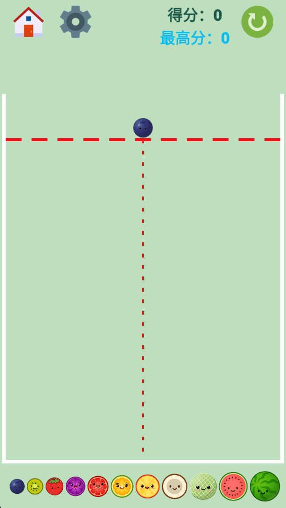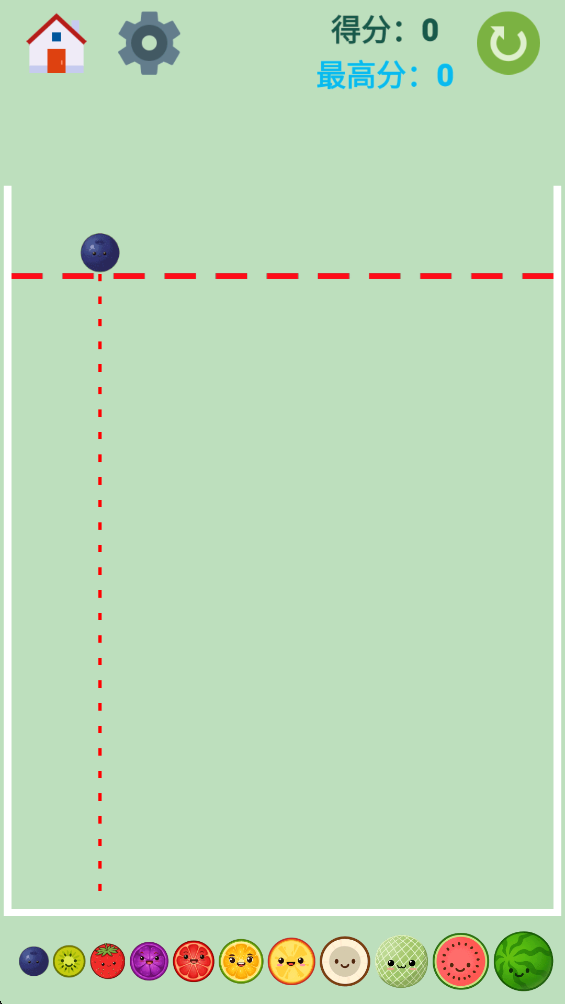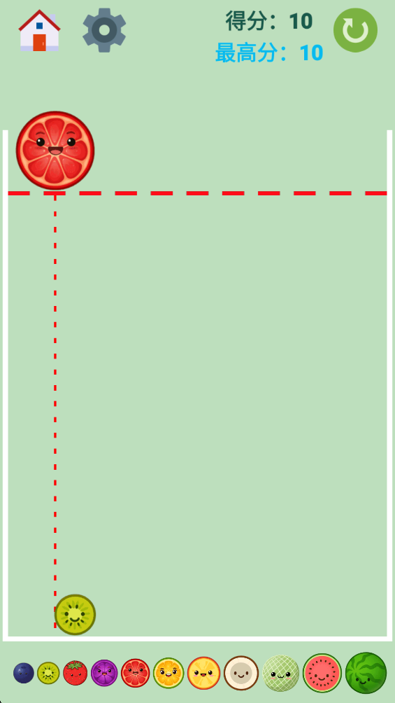 3.玩家可以滑动屏幕控制上面水果移动,再次放开手就能让水果掉下来。