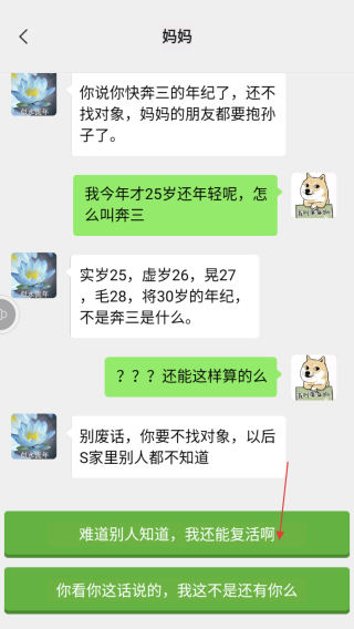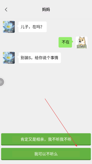 2、根据妈妈后续消息,选择合适的绿色对话框内容回应,如回复肯定又是相亲,我不听我不听。
