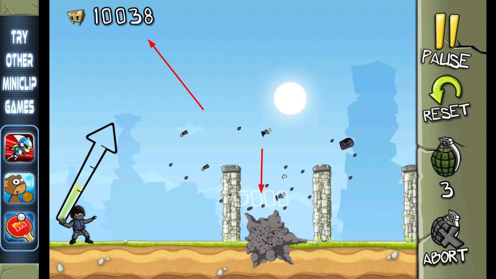 2、武器爆炸后可破坏建筑、击中敌人,获取分数奖励,逐步积累游戏分数,提升冒险成果。