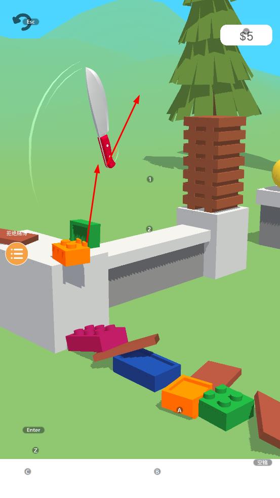 1、操控刀具向目标投掷,击中彩色积木等物体,破坏积木堆,开启游戏内的破坏挑战。