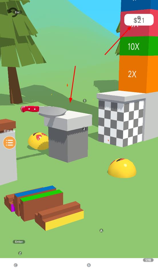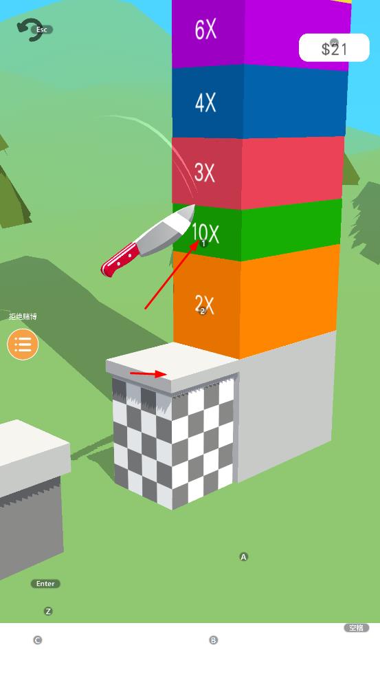 4、瞄准彩色倍数柱,精准投掷刀具,借助倍数效果获取更多金币,推进游戏进程。
