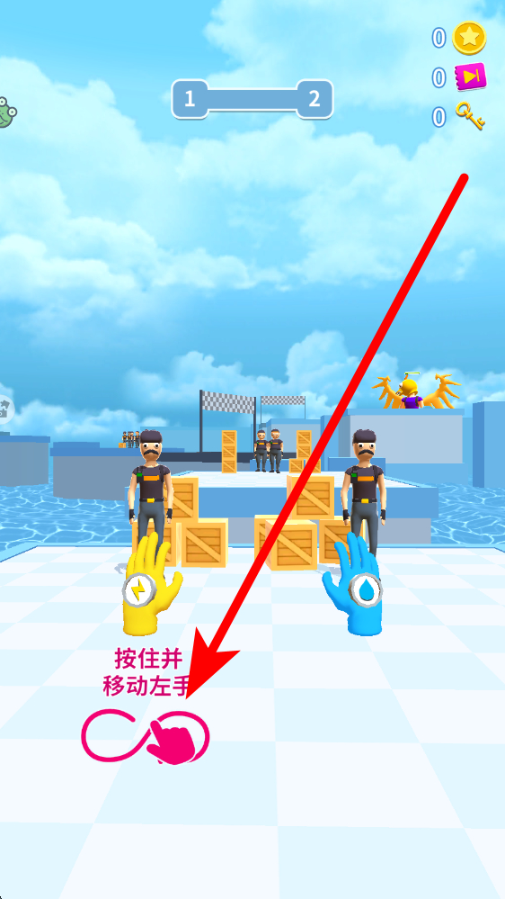 1、首先会有按住并移动左手的提示,新手需按照提示,按住对应区域并移动左手,熟悉左手的操控方式,为后续操作打好基础。