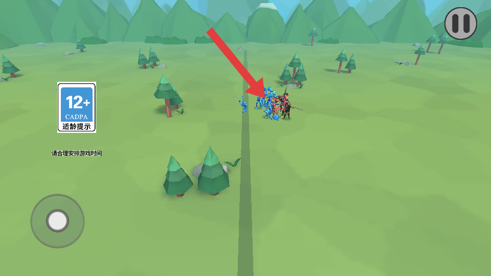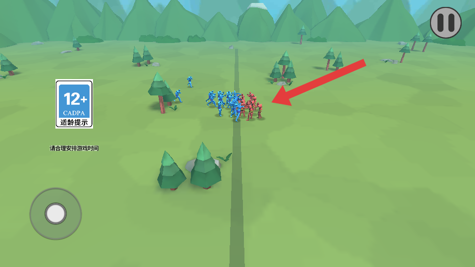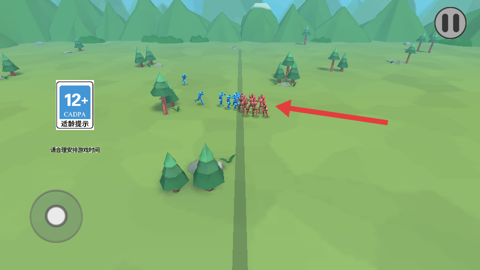 1、先观察红蓝士兵的初始分布与数量,利用左下角操控按钮,指挥己方士兵向敌方发起进攻,初期可集中兵力突破敌方薄弱处。