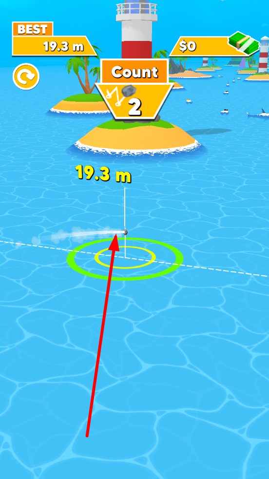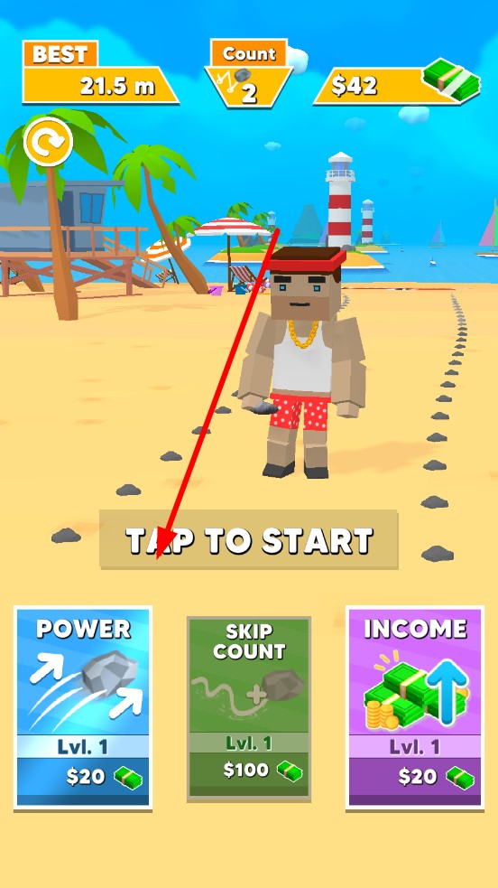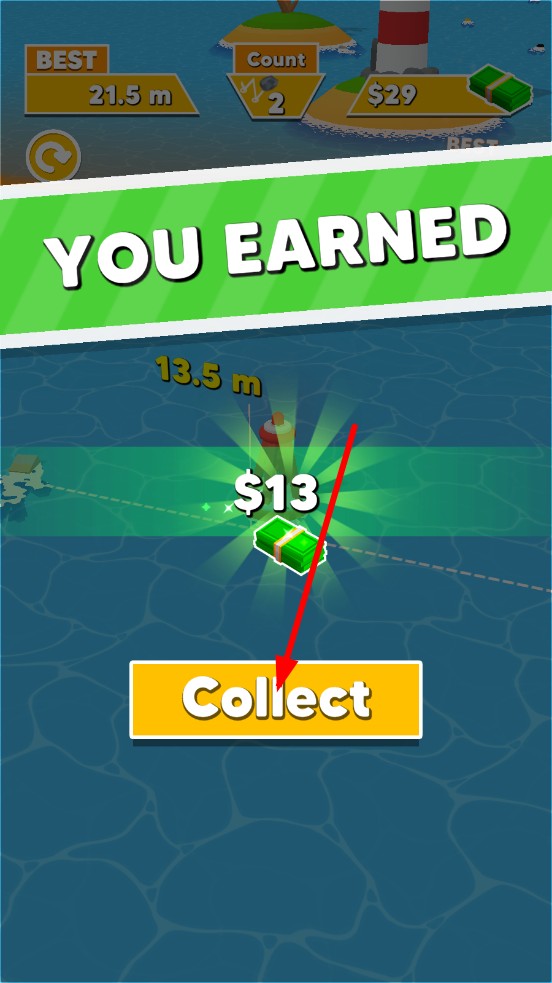 1、进入关卡,观察水域,人物冲刺,离终点线越近的时候,松手发射石头,首投的角度和力度决定初始轨迹。