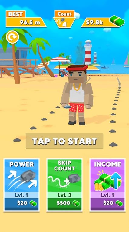 3、石头养成系统:从鹅卵石到金属石,每种石头弹跳曲线独特;消耗金币升级空气动力学、弹性核心,定制专属打水漂神器,养成覆盖性能与外观,养成覆盖性能外观定制化。