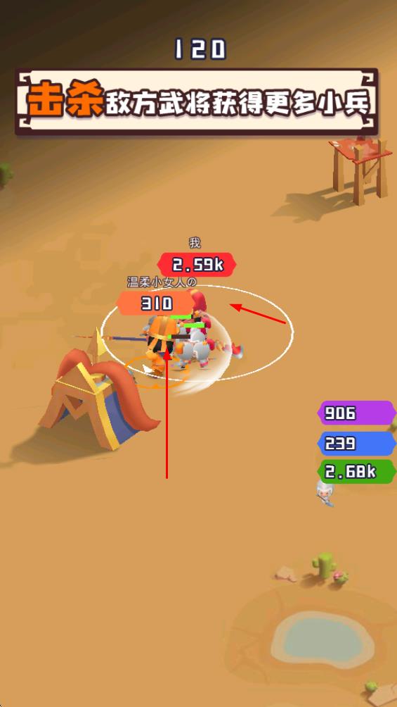 1、控制士兵行走对战:进入挑战后,操控士兵在场地中自由行走,途中留意其他士兵的实力差异,主动接近并战胜弱于自己的对手以获取成长,同时及时避开实力更强的敌人。