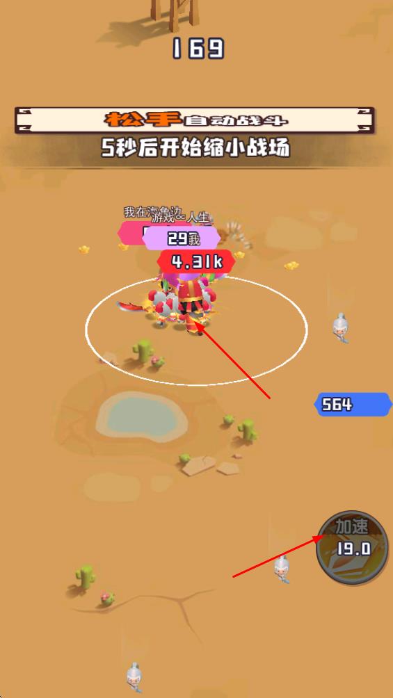 3、注意战场缩小提示如5秒后开始缩小战场,可点击加速按钮提升战斗节奏,在有限战场内争取胜利。