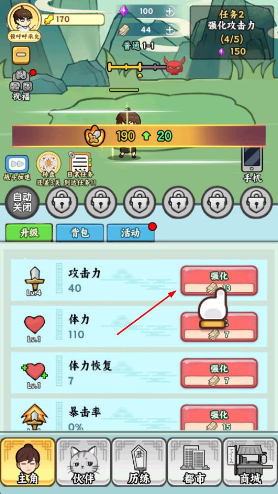 1、在升级界面,点击强化按钮提升攻击力、体力等属性,消耗对应道具或资源,增强角色战斗能力,为挑战关卡做准备。