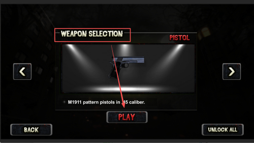 3、如何挑选武器?在“WEAPON SELECTION”界面点击“PISTOL”确认武器后点击“PLAY”。