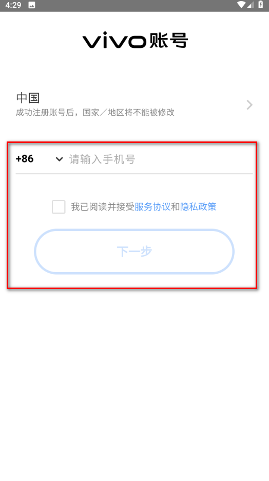 4.输入自己的手机号码,勾选我已阅读并接受服务协议和隐私政策。点击下一步即可,如下图所示。