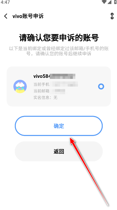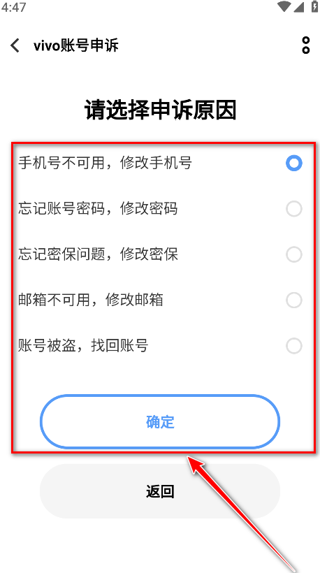 11.选择申诉原因,点击确定。然后按照软件的提示操作即可换绑手机号。