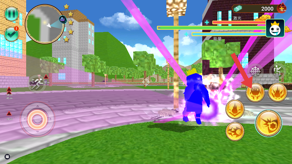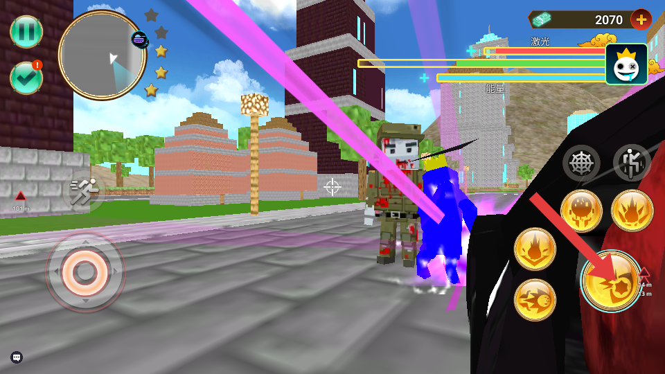 1、在游玩页面中,操控角色在像素城市场景移动时,注意观察周围敌人分布,提前做好战斗准备。