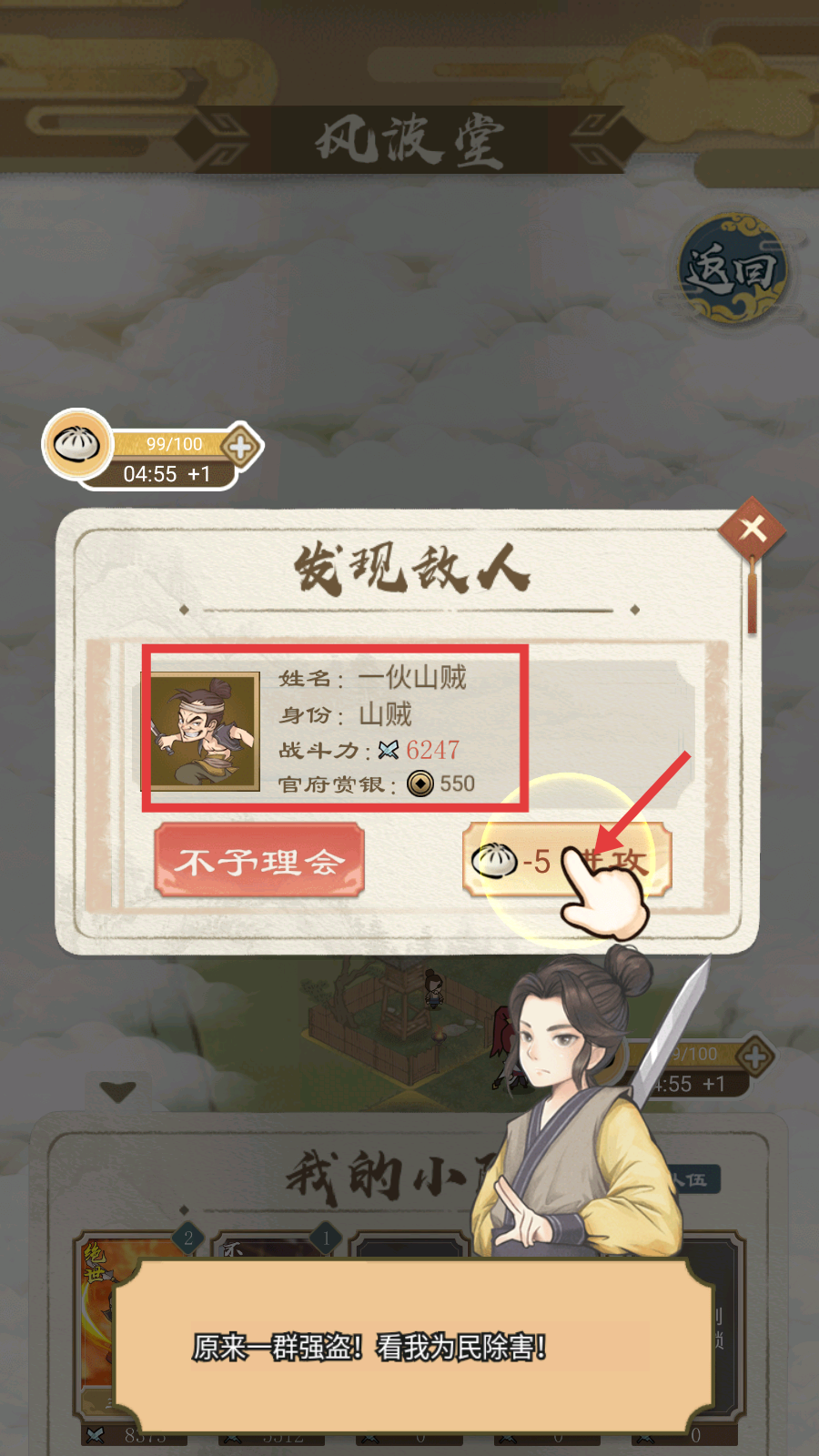 1、发现【一伙山贼】,战斗力【6247】,官府赏银【550】,消耗5包子点击【进攻】,开启战斗为民除害。