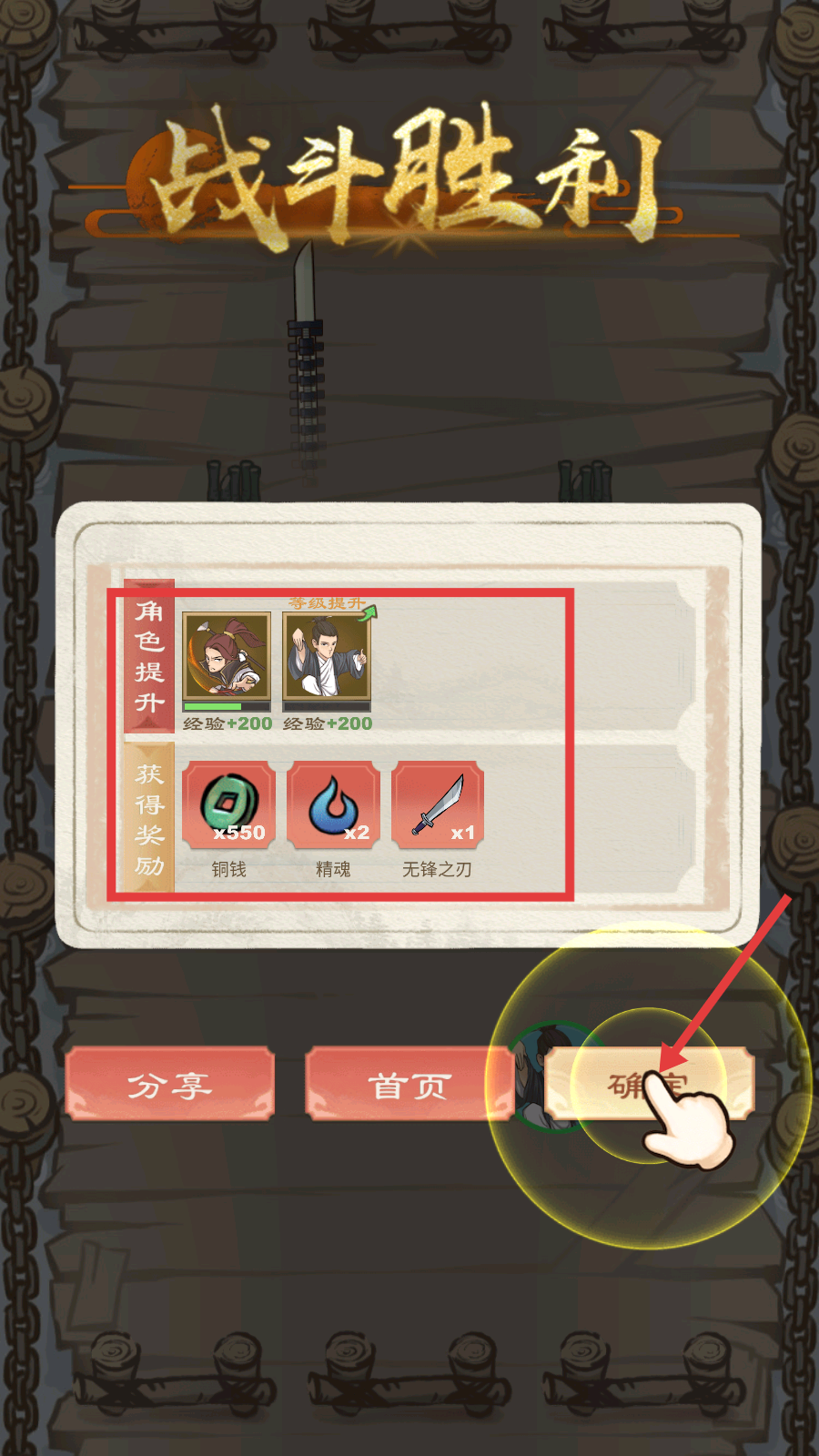 4、战斗胜利后,角色获得经验提升,还能得到【铜钱-550】【精魂-2】【无锋之刃-1】,点击【确定】结算奖励。