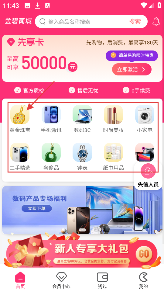 1、进入金碧商城首页,可从黄金珠宝、手机通讯等分类里选,也能搜索商品,开启购物。