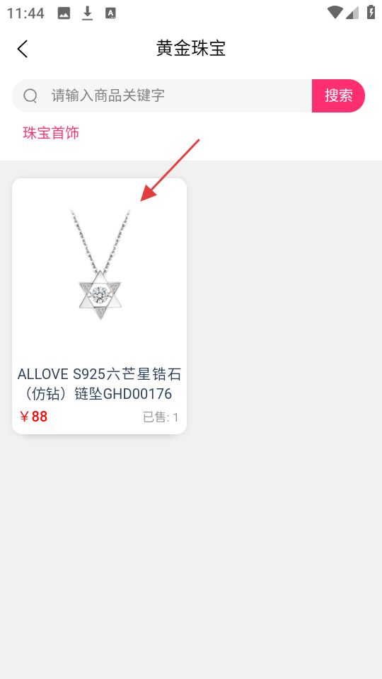 2、点【黄金珠宝】,浏览珠宝首饰,如六芒星锆石链坠,查看价格与销量,挑选心仪珠宝。