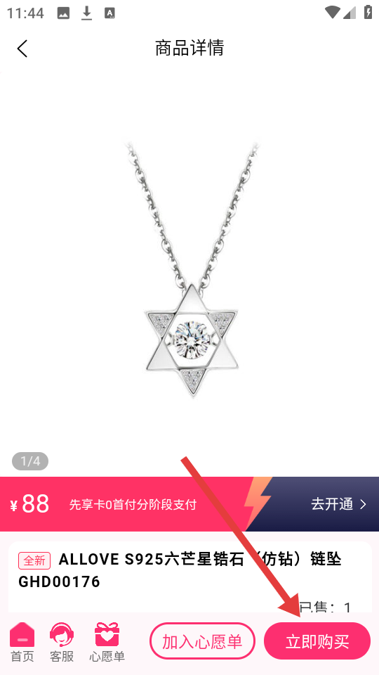 3、进入六芒星锆石链坠详情页,可加入心愿单,也能点【立即购买】,享受先享卡支付。