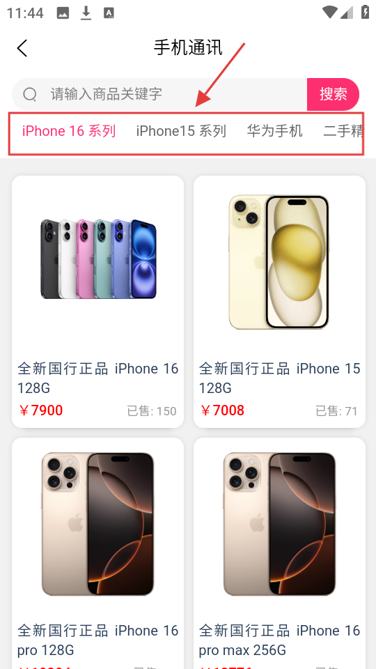 4、切换到手机通讯分类,可看iPhone16系列、华为手机等,选心仪手机,查看详情与价格。