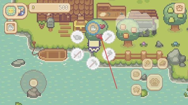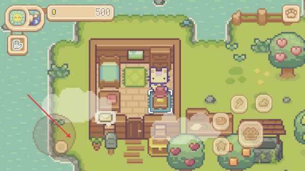 4、当靠近可互动的物体,比如树木、建筑等,点击出现的类似手掌的互动按钮,进行资源采集、任务触发等操作。