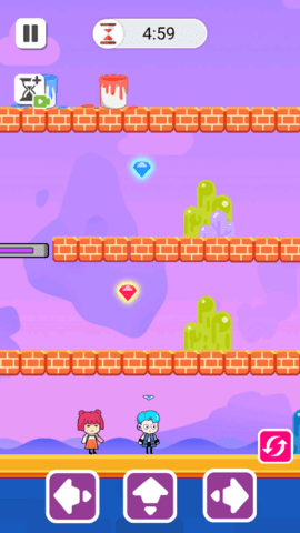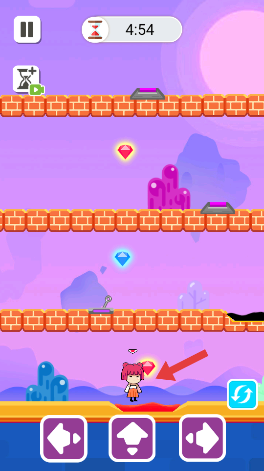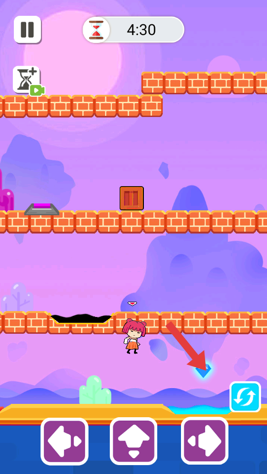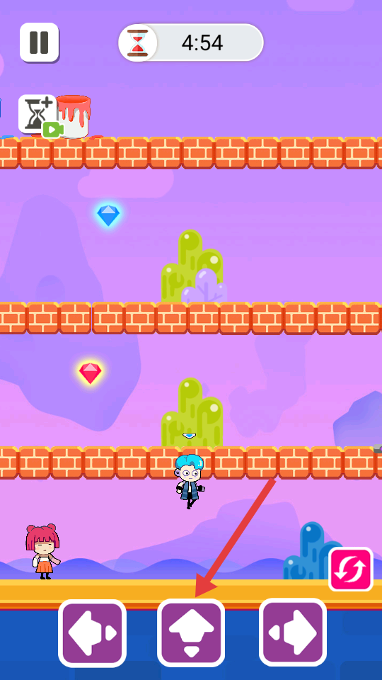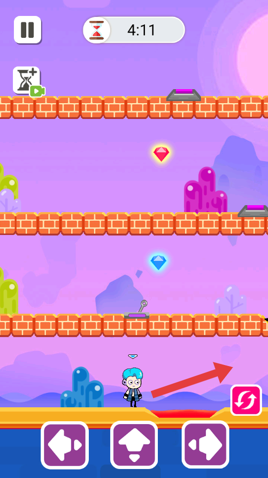 1、操控角色时,点击下方向上箭头按键,可让角色向上跳跃,借此获取高处钻石,能躲避下方危险区域。