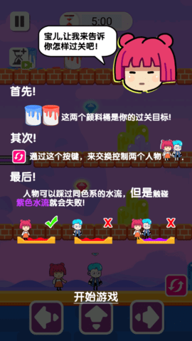1、双角色协同闯关:采用经典闯关玩法但升级难度,要求玩家同时操控冰小人与火小人,精准协调二者的技能释放与移动节奏,通过破解地形阻碍。