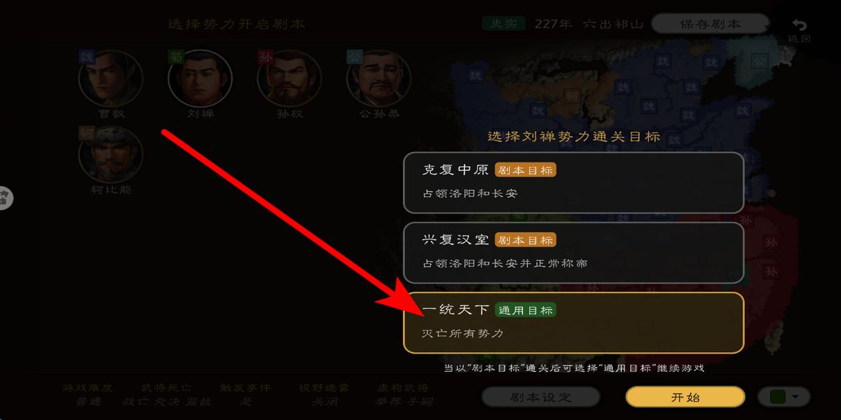 1、选择要完成的目标,在势力目标选择,有克复中原兴复汉室一统天下等目标可选,不同目标对应不同的征战方向与胜利条件,选好目标为势力发展指明道路。