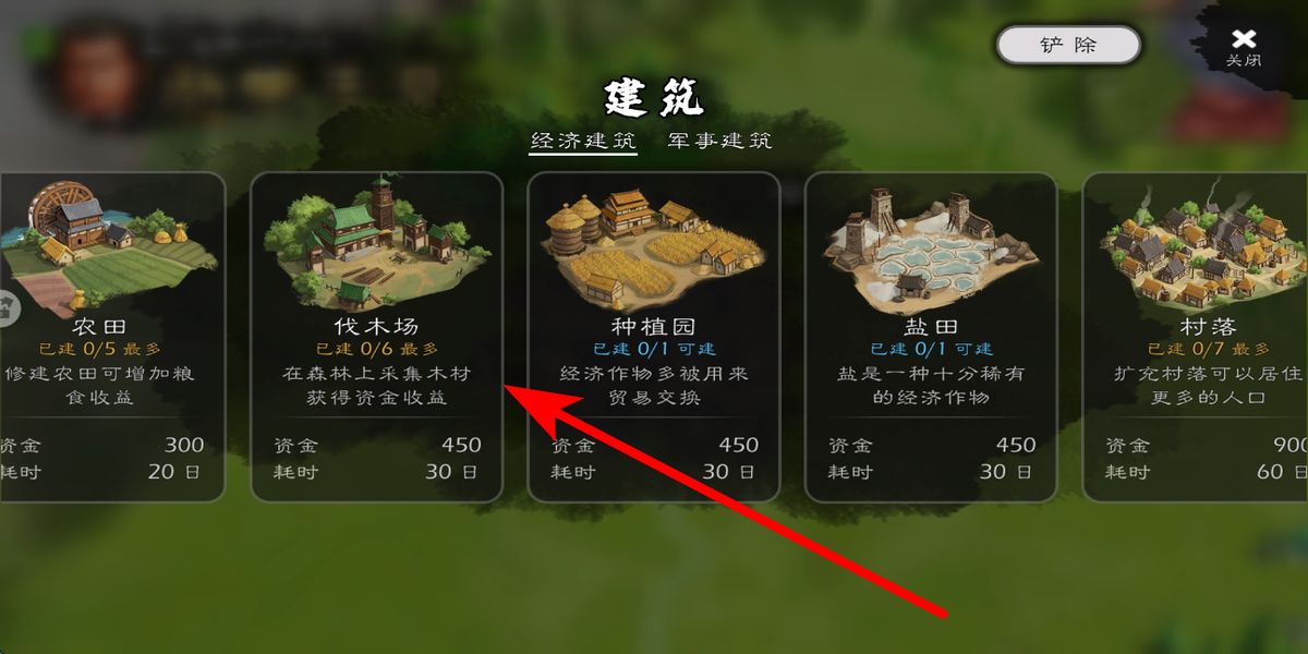 2、然后建造资源点,在建筑界面,可建造农田、伐木场等经济建筑,农田能增加粮食收益,伐木场可在森林上采集木材获得资金收益,为势力发展积累资源。