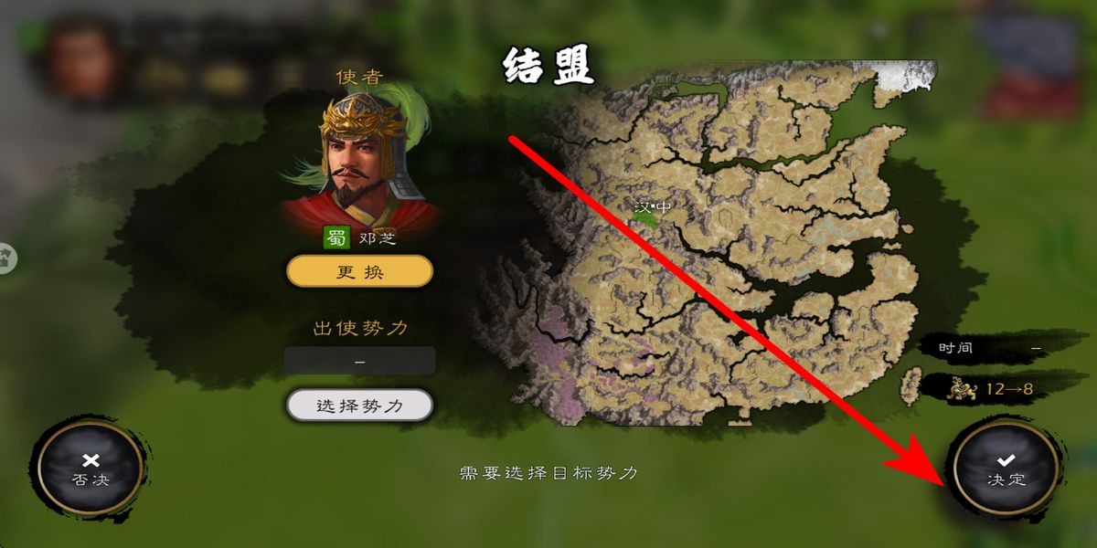 4、最后进行结盟,在结盟界面,选择出使势力,确定目标势力后点击决定,可尝试与其他势力建立同盟关系,借助同盟力量,更好地应对征战等挑战。