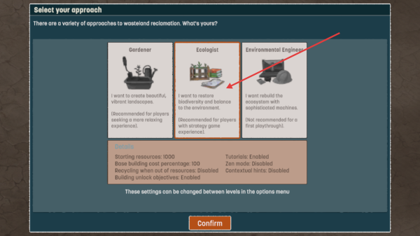 2、在界面,从Gardener、Ecologist、EnvironmentalEngineer中选择玩法,点击Confirm确认。