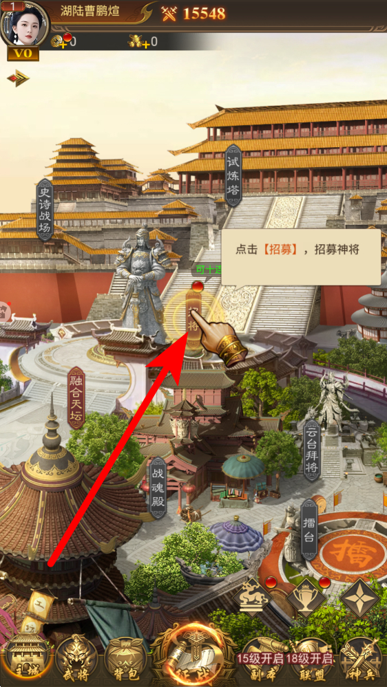 3、接着进行招募武将,点击招募按钮,可招募神将,像黄月英等武将都有机会被招募到麾下,充实自己的武将阵容,增强战力。