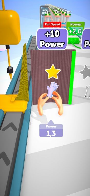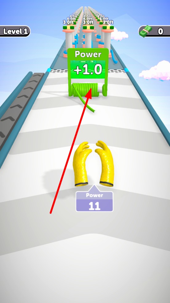 1、进入关卡轻划屏幕操控手套起跑,观察长绳索卷轴,规划路线,靠近时手套自动吸附,积累初始长度,为后续的升级做准备。