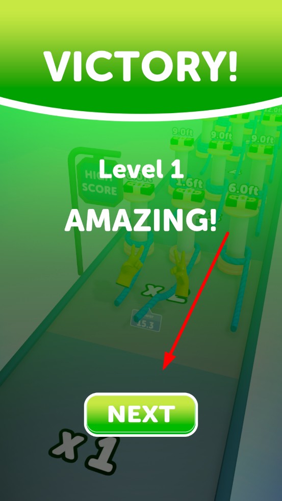 3、抵达终点绳索长度达标触发胜利判定,屏幕弹出VICTORY,点击NEXT踏入下一关,解锁更加复杂的全新赛道。