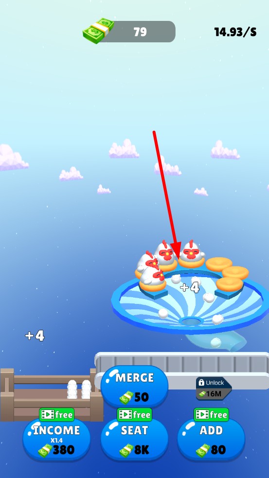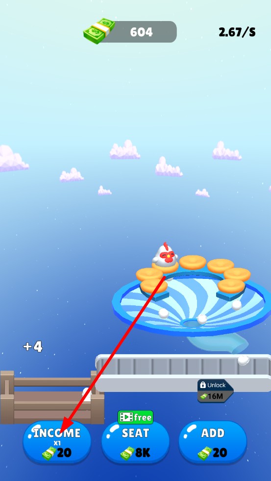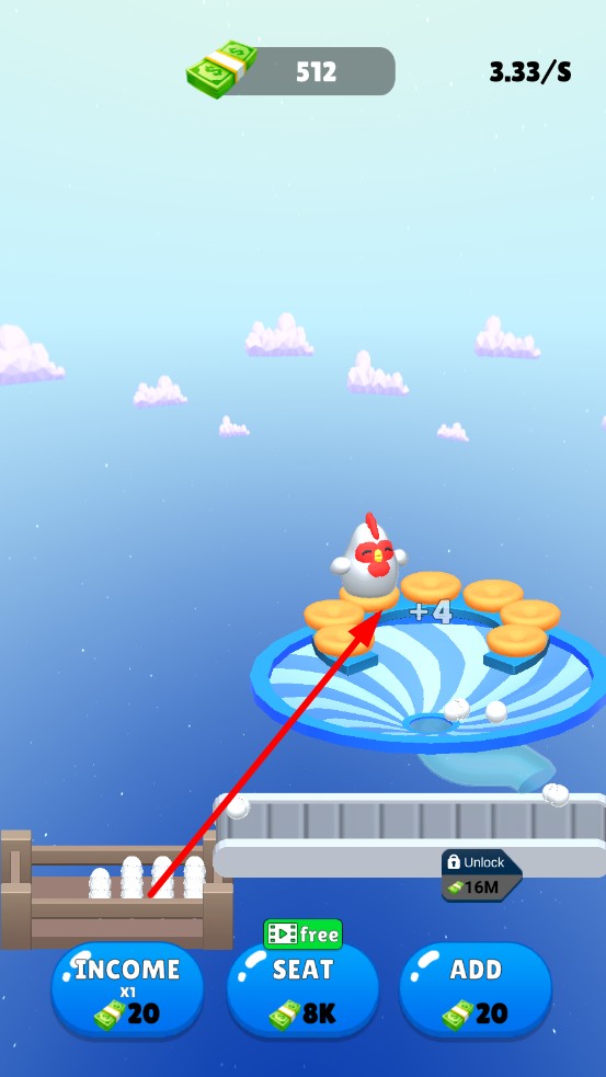 1、点击屏幕,小鸡会产出蛋,观察产蛋频率与初始金币增速,规划首笔资金用途,升级座位扩大养殖位。