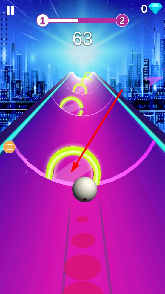 2、赛道滚动时,点击屏幕左右区域,调控方向,引导小球穿入发光传送门,触发分数加成,若没有通过发光传送门,则游戏失败。