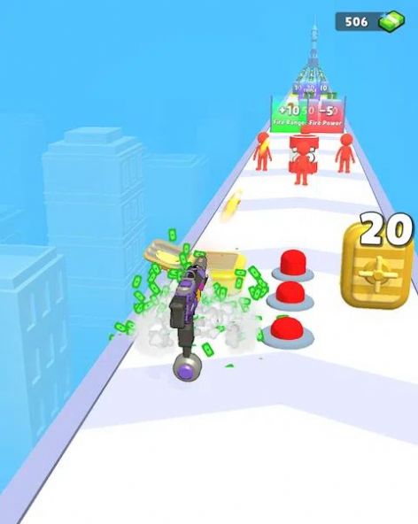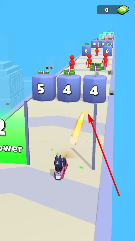 2、闯关时灵活操控角色迂回移动,瞄准赛道标有数字的方块与红色敌人射击,击碎方块收获资源,击败敌人,清除前进阻碍。