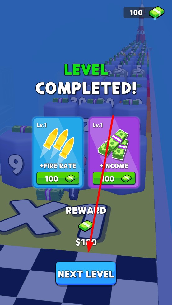 3、通关后从射速提升、收益增加、弹药扩容等奖励中择一领取,结合当前枪支的短板进行选择,点击NEXT LEVEL进入下一关。