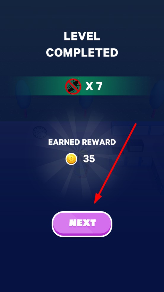 3、通关后屏幕显示LEVEL COMPLETED,统计清除害虫数,获金币奖励,点击NEXT进入新关卡,新关卡增添更多的害虫需要消灭。