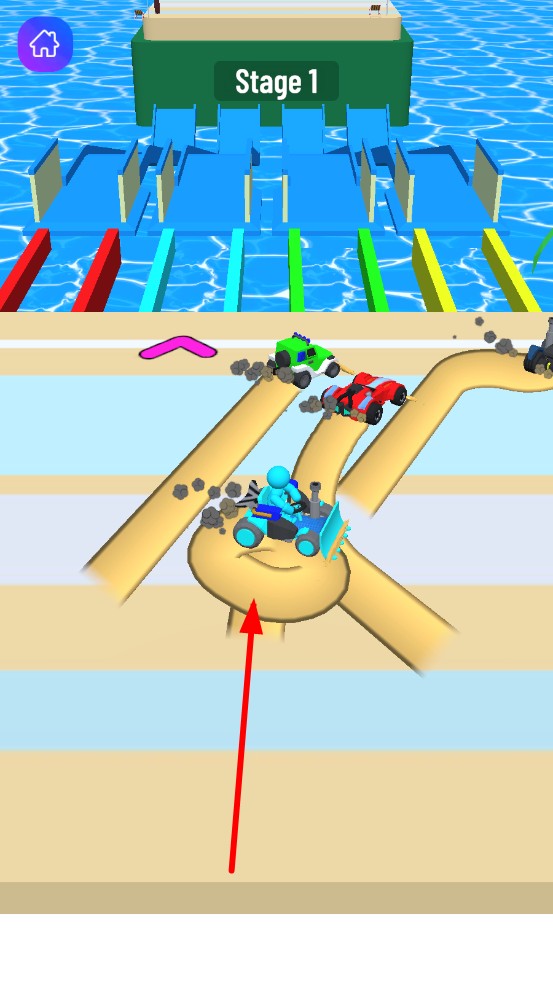 2、竞速途中,观察对手动向,使用铲沙阻碍其行进,同时抓紧时间,收集沙子,铺成前进的道路。