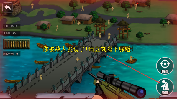 2、游戏中被敌人发现时迅速点击右下角隐蔽按钮蹲下躲避敌人攻击。