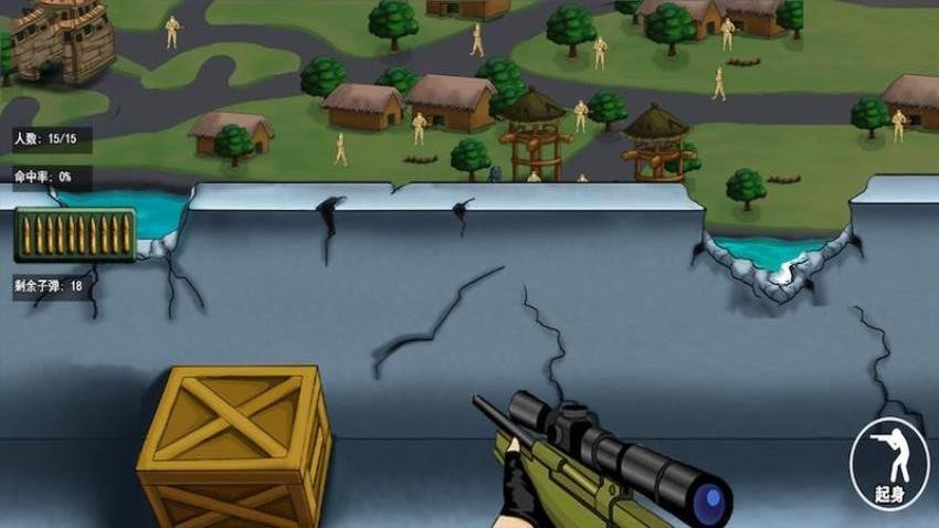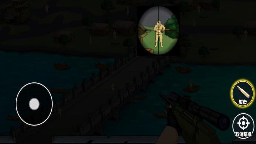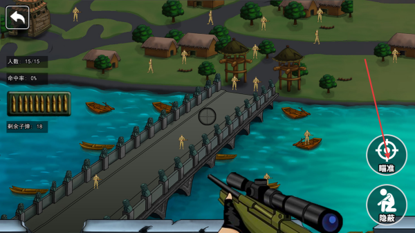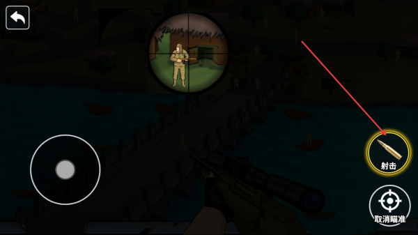 4、瞄准敌人后点击射击按钮发射子弹击杀敌人完成关卡任务。