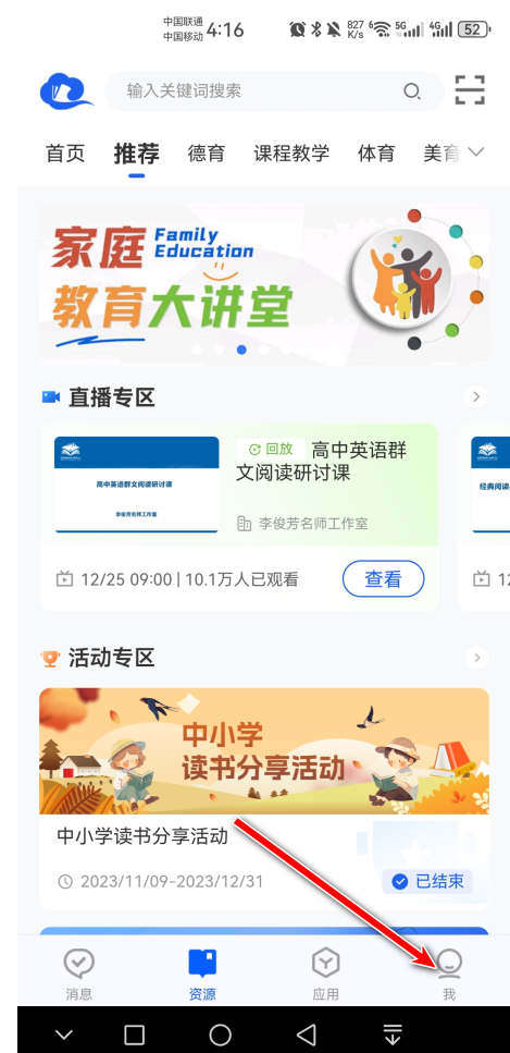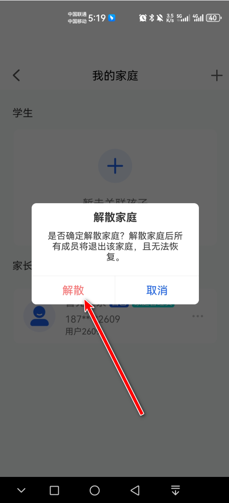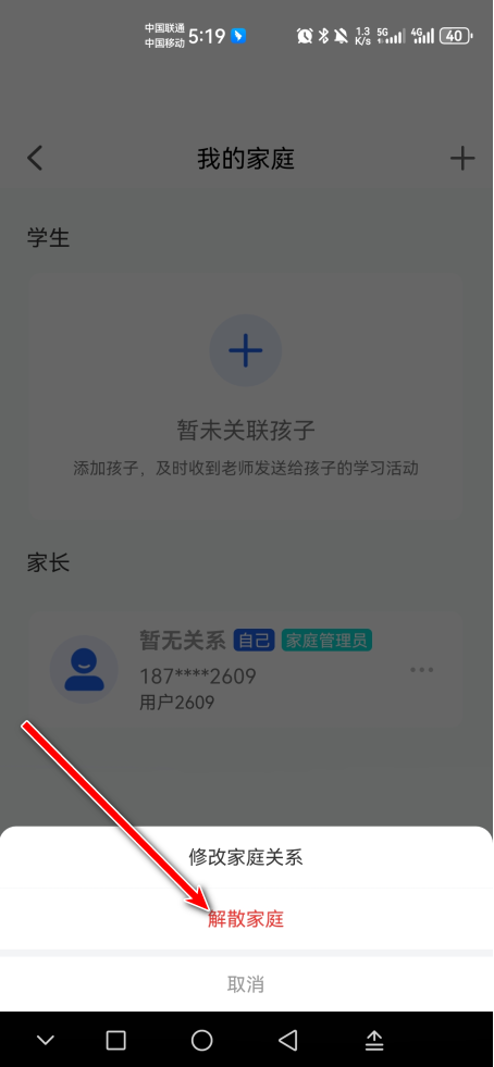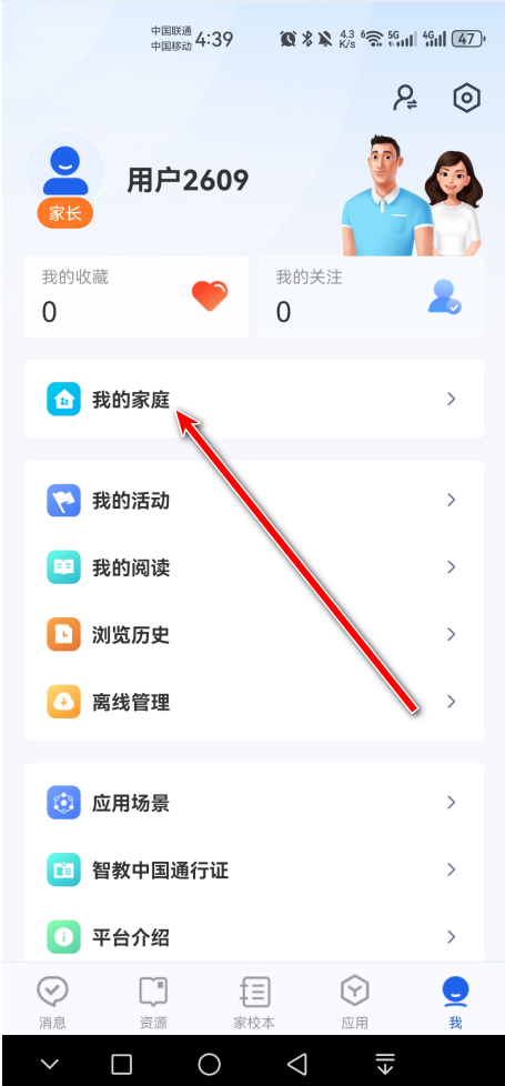 4.然后我们再登录自己作为家长身份的账号,点击主页右下角我的。再点击我的家庭。