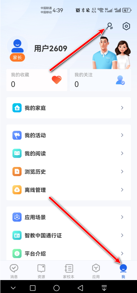 2.然后我们找到第二个孩子的智慧中小学账号,点击我的,然后再点击左上角的学生头像。