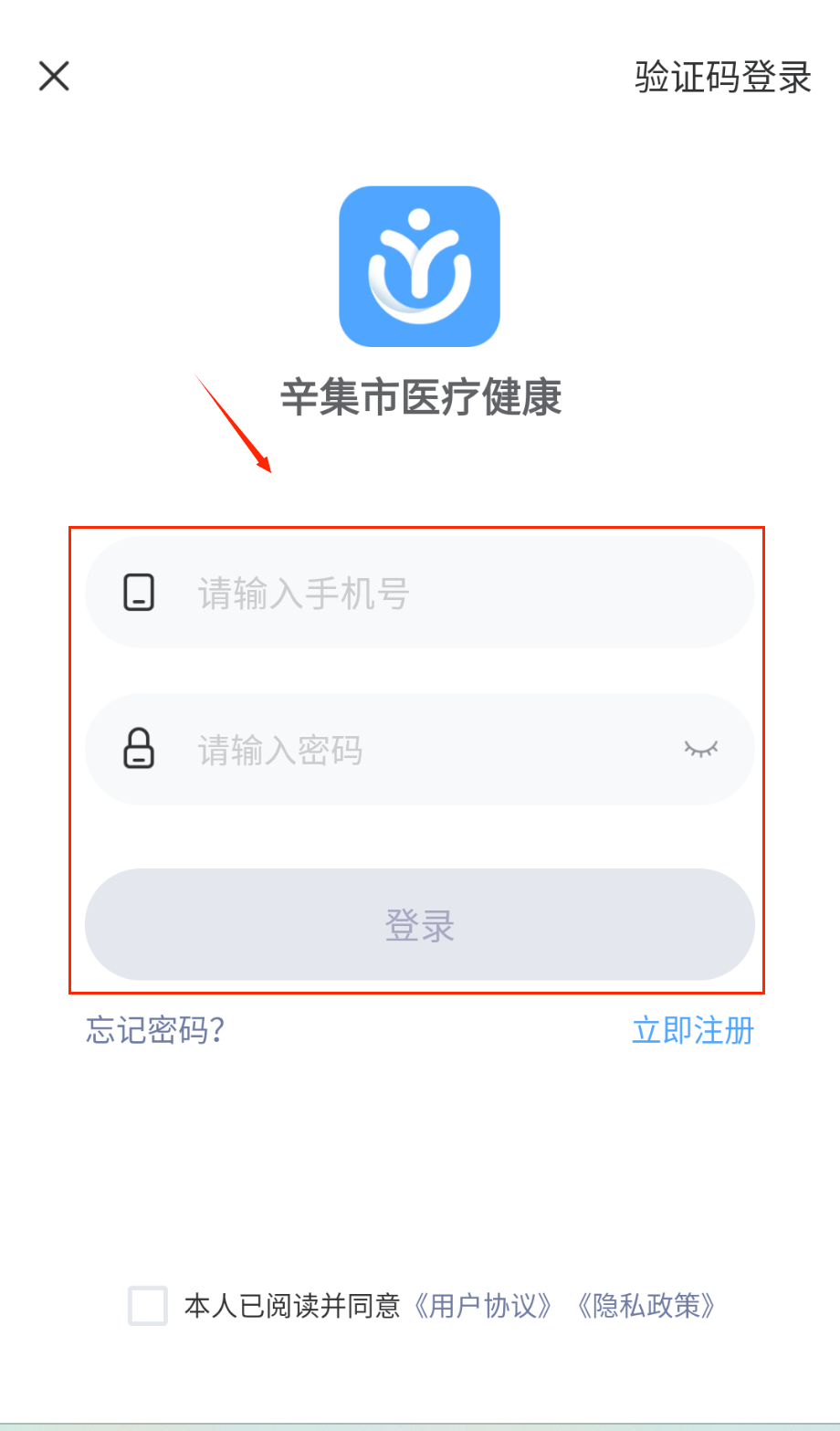 1、打开软件看到蓝色图标和“辛集市医疗健康”字样,在第一个带手机图标的框里输入11位手机号,注意检查有没有输错数字。