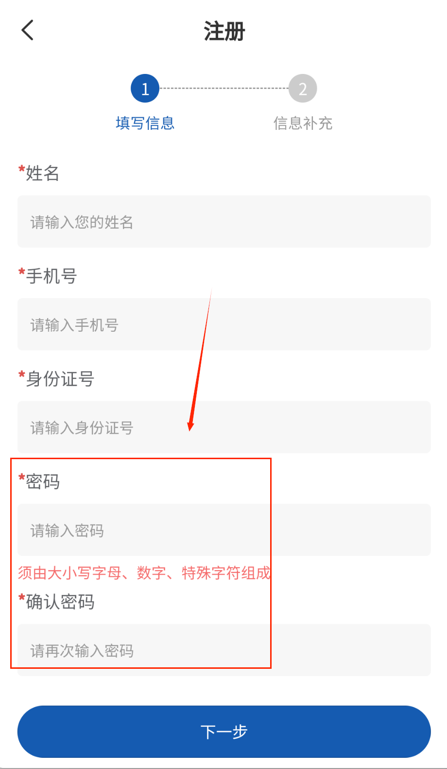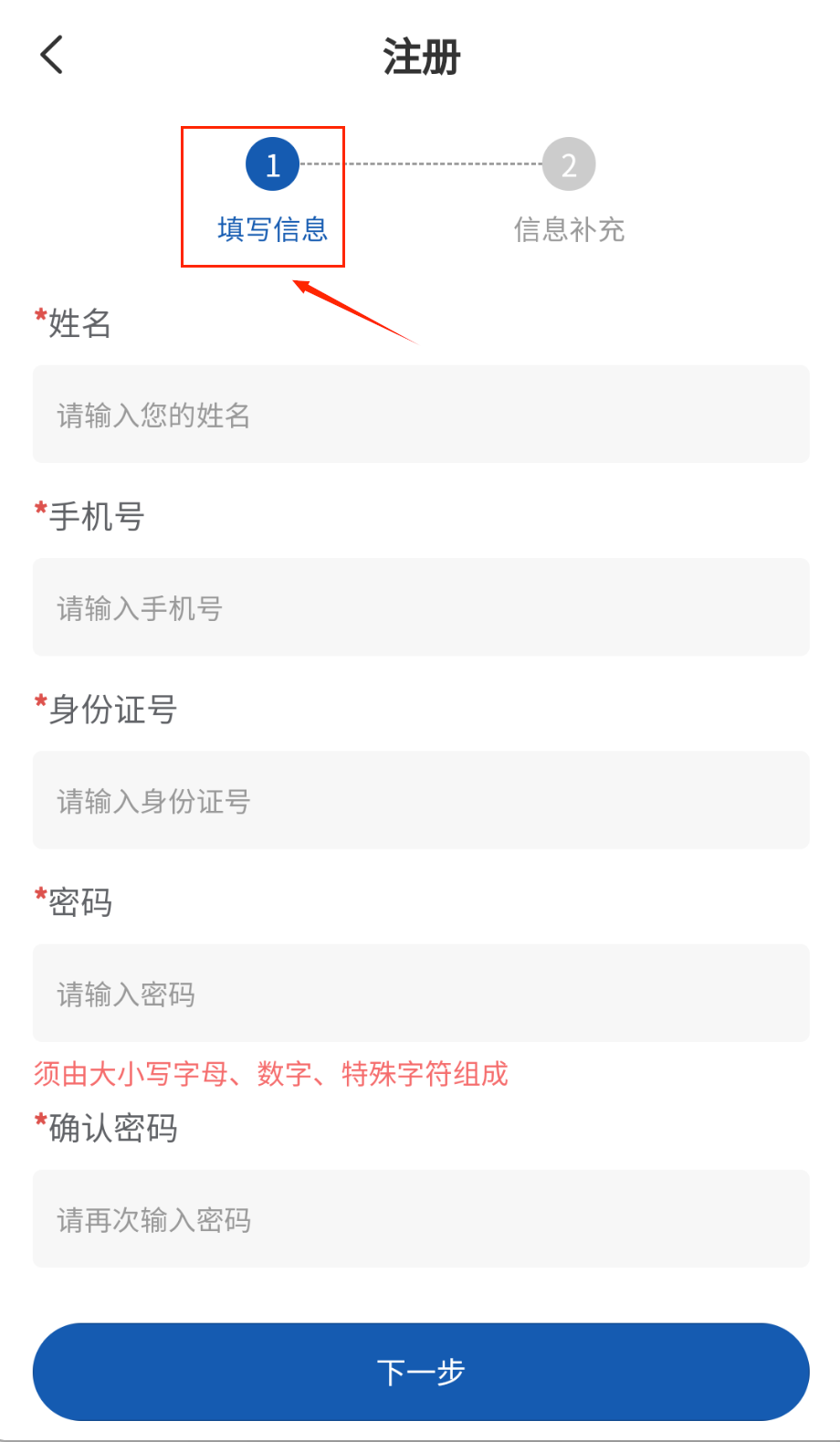 1、打开软件就能看到注册入口啦,在“填写信息”页面按顺序填好姓名、手机号、身份证号这些带红色星号的必填项。