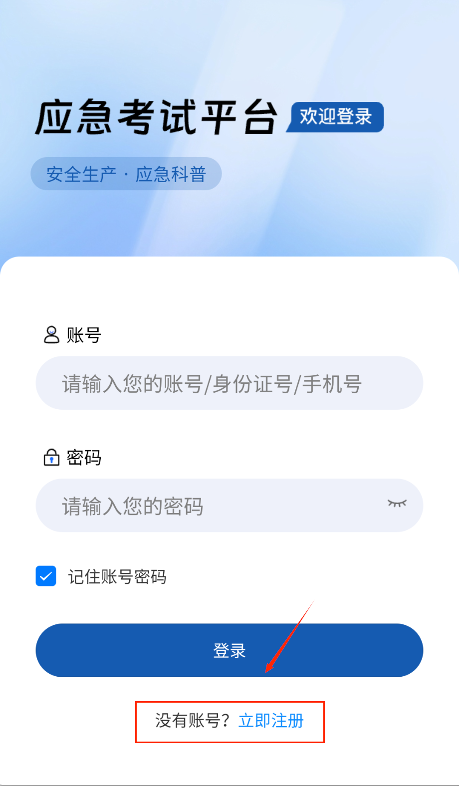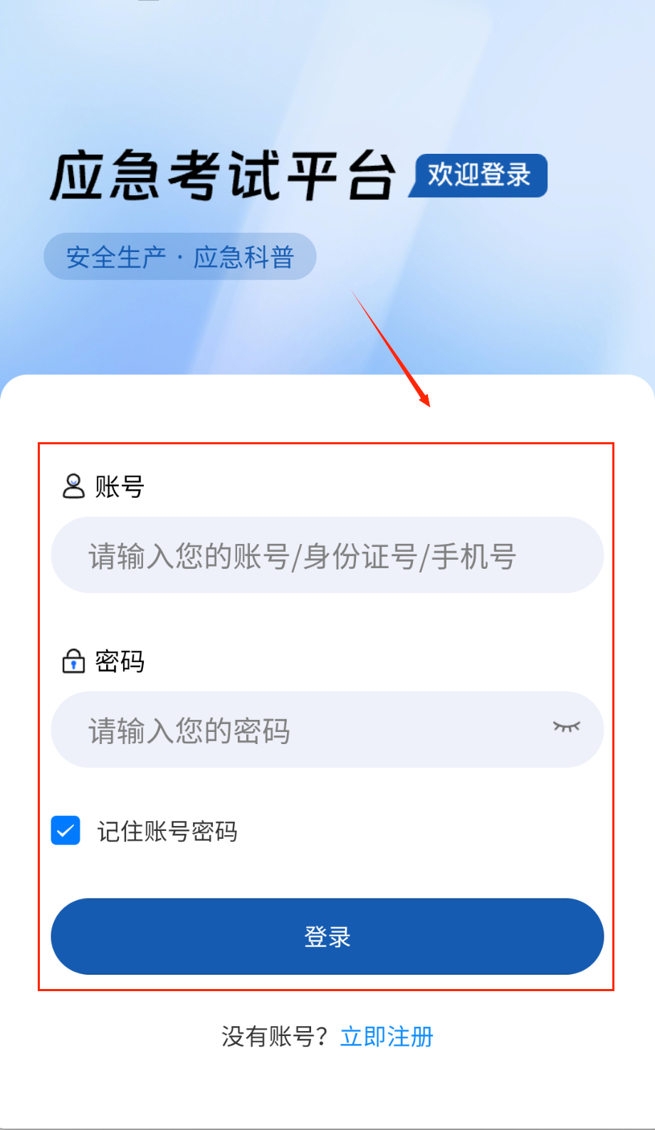 3、登录时在账号框可以灵活输入注册的手机号、身份证号或者自定义账号,密码框旁边有小眼睛图标能切换显示隐藏密码。